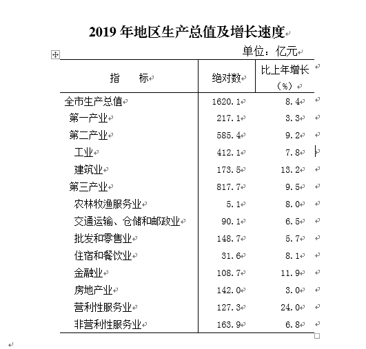 初步核算,2019年实现地区生产总值(GDP)1620.1亿元,按可比价格计算,比上年增长8.4%。分产业看,第一产业增加值217.1亿元,增长3.3%;第二产业增加值585.4亿元,增长9.2%;第三产业增加值817.6亿元,增长9.5%。三次产业结构由上年的13.6︰36.2︰50.2调整为13.4︰36.1︰50.5。按常住人口计算,人均生产总值33370元,比上年增加3309元。