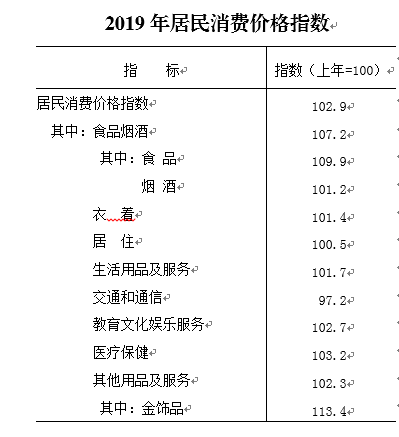 2019年,居民消费价格指数为102.9%,居民消费价格比上年上涨2.9%。其中,医疗保健类价格上涨3.2%,食品类价格上涨9.9%,居住类价格上涨0.5%。工业生产者购进价格指数97.6%;工业生产者出厂价格指数103.5%。
