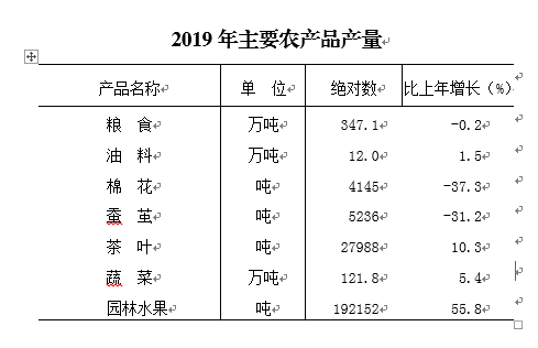 2019年,全市粮食种植面积607615.1公顷,比上年减少2708.4公顷;油料种植面积52678公顷,比上年减少851公顷;棉花种植面积4733公顷,比上年减少2041公顷;蔬菜种植面积53776公顷,比上年增加2828公顷。全年粮食产量347.1万吨,下降0.2%;油料产量12万吨,增长1.5%;棉花产量4145吨,下降37.3%。蔬菜、水果在品种优化的基础上平稳发展。