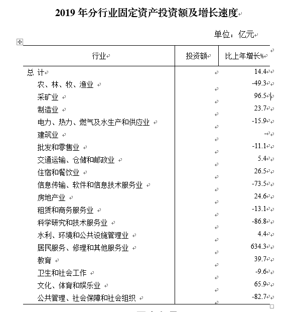 2019年全年完成固定资产投资比上年增长14.4%。分产业看,第一产业投资下降49.3%;第二产业投资增长18.0%;第三产业投资增长14.8%。