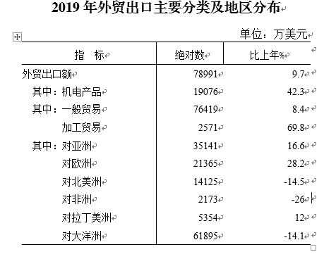 2019年,全市实现进出口总额87874.4万美元,比上年增长8.1%。其中,出口78991.1万美元,增长9.7%;进口8885万美元,下降4.4%。