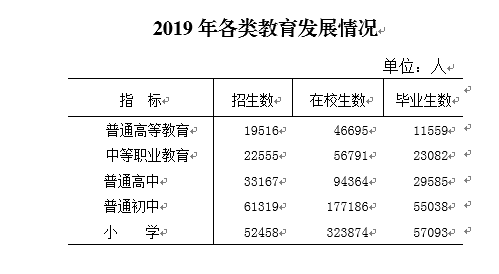 2019年,全市普通高校4所,当年招生19516人,增长58.8%;在校生46695人,增长16.7%;毕业生11559人,下降10.6%。各类中等职业教育学校28所(不含技工学校),当年招生22555人。普通高中52所,招生33167人,高中阶段毛入学率115.8%。普通初中288所,招生61319人,初中学龄人口入学率为100%。小学568所,招生52458人,小学入学率为100%。