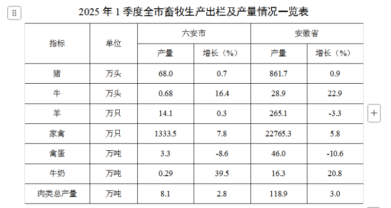 3.肉产增长相对显弱,牛奶产量增加较快。一季度,全市肉类总产量8.1万吨,同比增长2.8%,比去年同期回升6.8个百分点,但仍低于全省0.2个百分点。其中,猪肉产量5.6万吨,增长0.9%;牛肉产量0.11万吨,增长22.8%;羊肉产量0.22万吨,增长0.3%;禽肉产量2.1万吨,增长7.5%;禽蛋产量3.3万吨,下降8.6%;生牛奶产量0.29万吨,增长39.5%,较去年同期提升7.6个百分点,高于全省18.7个百分点。