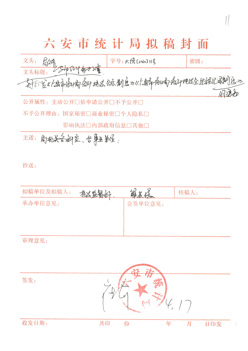 【合法性审查】六安市统计局关于印发《六安市统计局统计执法公示制度》《六安市统计局统计执法全过程记录制度》的通知