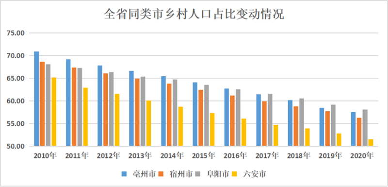 受城镇化建设和人口迁移流动影响,乡村人口不断向城镇转移,全市乡村人口占总人口的比重持续下降,由2010年的65.2%下降到51.5%,在全省同类市中降幅最大,比阜阳市、宿州市、亳州市分别高3.6、1.3、0.3个百分点。